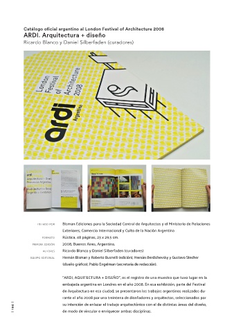 “ARDI, AQUITECTURA + DISEÑO”, es el registro de una muestra que tuvo lugar en la equipo editorial Hernán Bisman y Roberto Busnelli (edición y producción de la muestra); Hernán