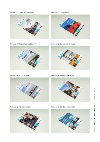 Número 5, “Materia de gestión”. Número 6, “Cultura cinética”. Número 13, “Mar a la vista”. Número 14, “Dialogo educativo”.